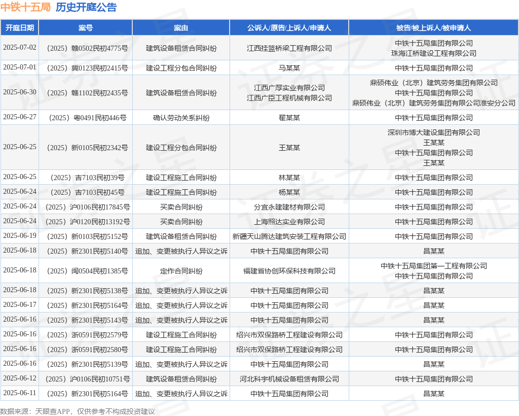 案号:(2025)新2301民初5164号审理法院:昌吉市人民法院案由:追加、变更被执行人异议之诉当事人信息: 原告/上诉人:中铁十五局集团有限公司 被告/被上诉人:昌某某开庭日期:2025年6月17日根据统计,近一年内以中铁十五局集团有限公司为当事人的历史开庭公告有308则,其中案由为“买卖合同纠纷”的公告以64则居首,其次为“建设工程施工合同纠纷”有33则,“建设工程分包合同纠纷”有30则。历史开庭公告(前20条)如下: