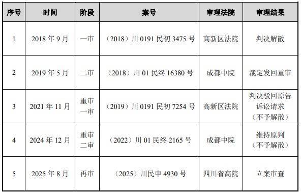 截至今年8月,管理层股东与实控人之间经历了当地法院一审、成都中院二审发回重申、当地法院重申一审、成都中院重申二审,目前处于四川省高院立案审查阶段。