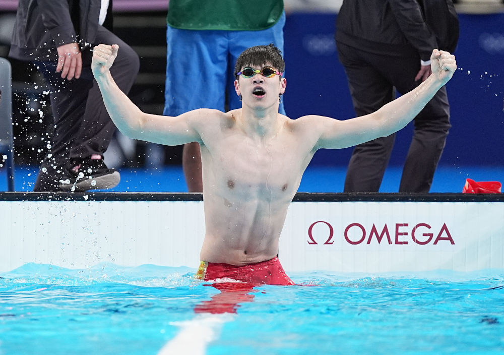 2024年7月31日,潘展乐在巴黎奥运会男子100米自由泳决赛后庆祝。新华社记者 杜宇 摄