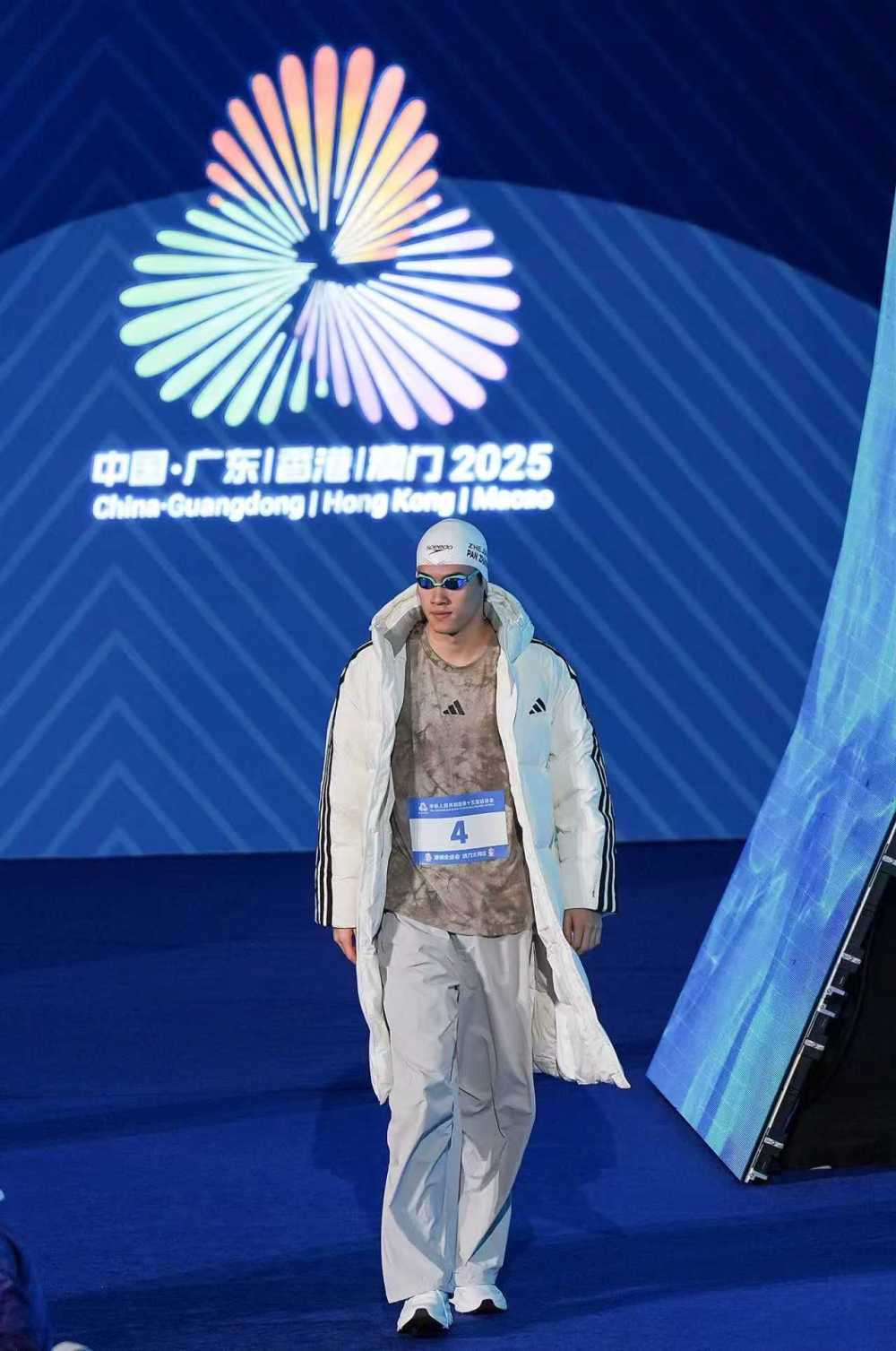 11月14日,浙江队选手潘展乐在比赛前入场。最终,他获得冠军。当日,第十五届全国运动会游泳男子100米自由泳决赛在广东省深圳市举行。新华社记者 夏一方 摄