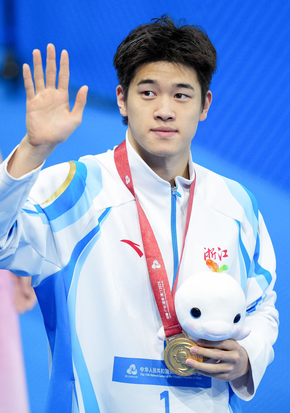 11月14日,第十五届全国运动会男子100米自由泳决赛赛后,冠军浙江队选手潘展乐向观众致意。新华社记者 夏一方 摄